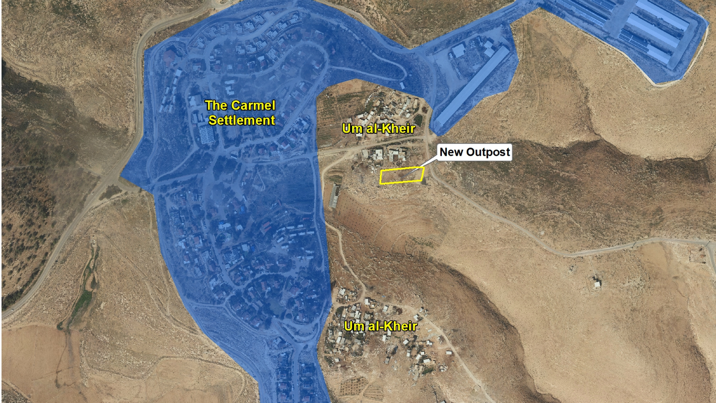 No início da década de 1980, Israel declarou cerca de 4.000 dunams na área como terras do Estado e os alocou à Divisão de Assentamentos para o estabelecimento dos assentamentos [ilegais, por se situarem em território ocupado] Carmel e Ma’on. O assentamento Carmel foi construído encostado às terras de Um al-Kheir. Em 2005, o Conselho Superior de Planejamento aprovou o Plano 507/1 para Carmel, que expandiu a área planejada do assentamento para incluir cerca de 2.200 dunams de terras abertas ao redor. Cerca de sete desses dunams ficam dentro da própria aldeia de Um al-Kheir, e nesses 7 dunams as caravanas foram estabelecidas. De acordo com o plano, a área onde o posto avançado foi construído é zoneada para uso agrícola, não para habitação.