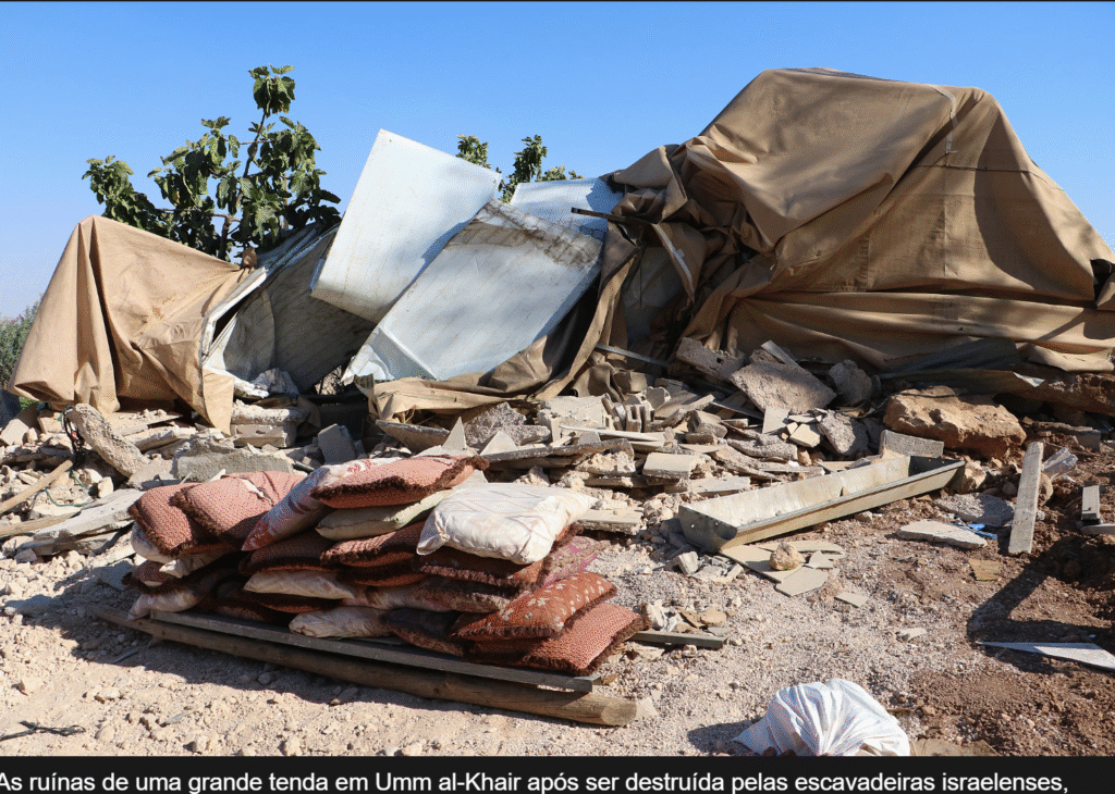 PAZ AGORA: “Durante meses, todas as autoridades policiais estiveram plenamente cientes do projeto de construção maciço e flagrantemente ilegal que está ocorrendo nas terras de Um al-Kheir. Eles não apenas não agiram, mas mesmo após uma ordem judicial clara, a atividade criminosa e o roubo de terras continuam sem controle. É ultrajante e indesculpável que, enquanto os israelenses estavam unidos em alegria pelo retorno dos reféns, os colonos infratores estavam desafiando abertamente o tribunal, e nem uma única autoridade interveio para fazer cumprir a lei.