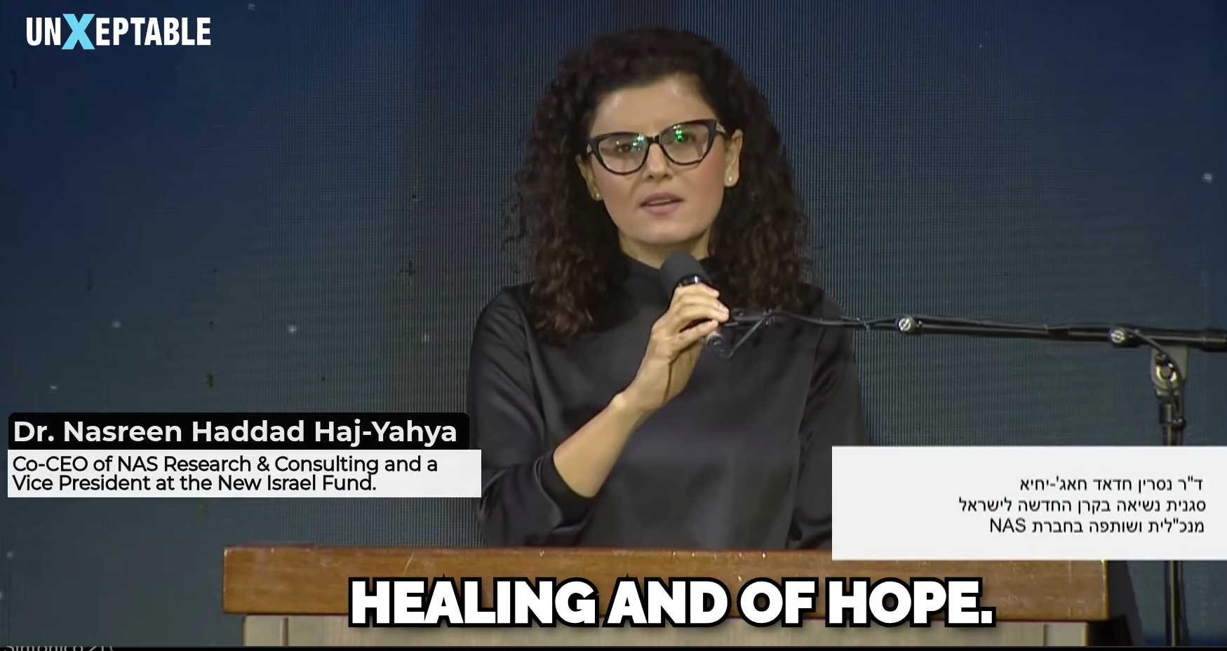 < A Dra Nasreen Haddad Haj-Yahya, vice-presidente do NIF (Novo Fundo de Israel); falou pela minoria árabe (20%) de Israel, (assista em hebraico com legendas em inglês do UnXeptable). Lembrou que os deputados representantes desta importante comunidade israelense não foram convidados para falar no evento.