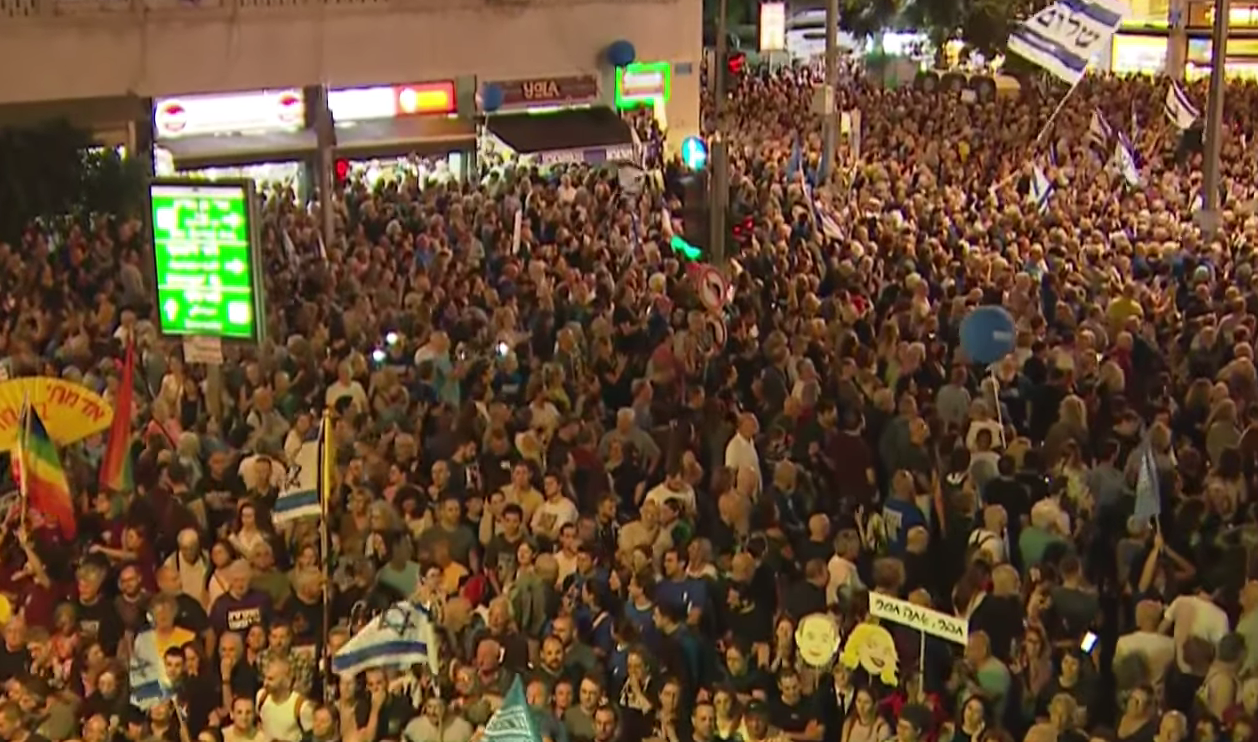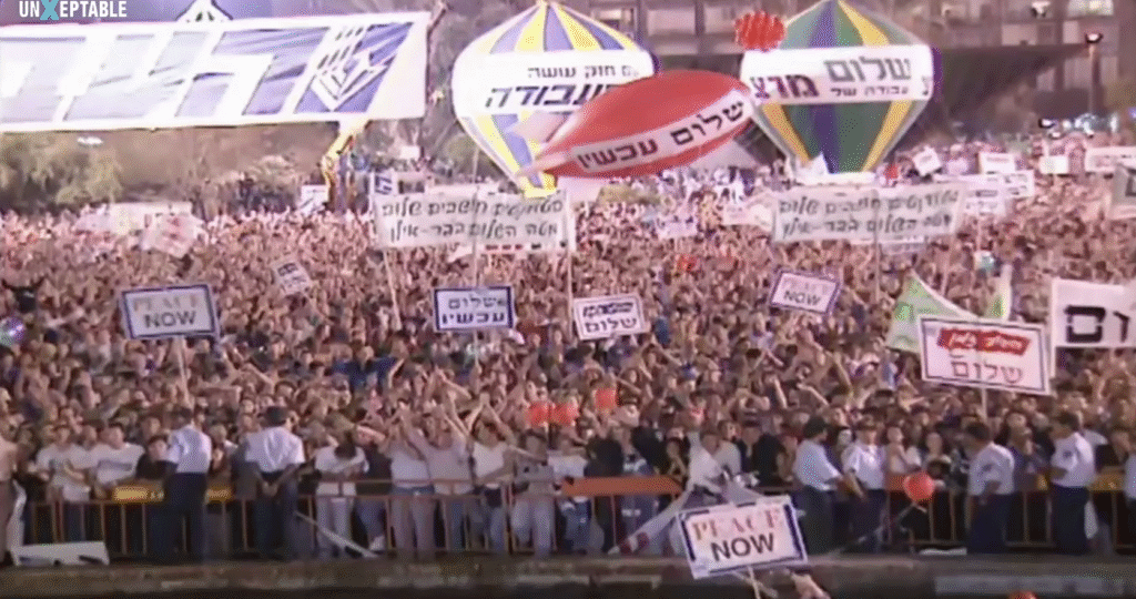 O ato foi realizado por 150.000 israelenses, no local em que o primeiro-ministro Yitzhak Rabin foi assassinado há 30 anos. Iniciou-se com imagens dele num discurso histórico defendendo “uma chance para a paz. Terminou com a multidão cantando “Uma Canção para a Paz”, [Shir La Shalom], música que cantou pouco antes de ser abatido a tiros em 1995.
