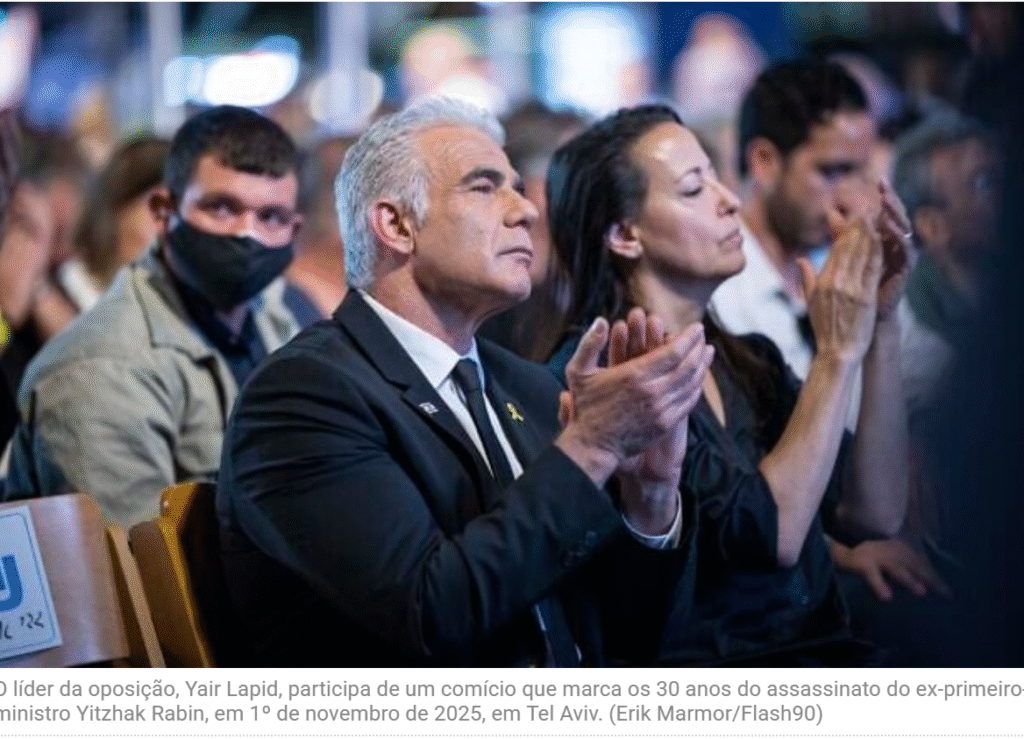 O líder da oposição no Parlamento, Yair Lapid, discursou no evento: “Neste dia, neste lugar, convergem os dois maiores momentos de ruptura na história do Estado de Israel – o assassinato de Rabin e o 7 de outubro.”