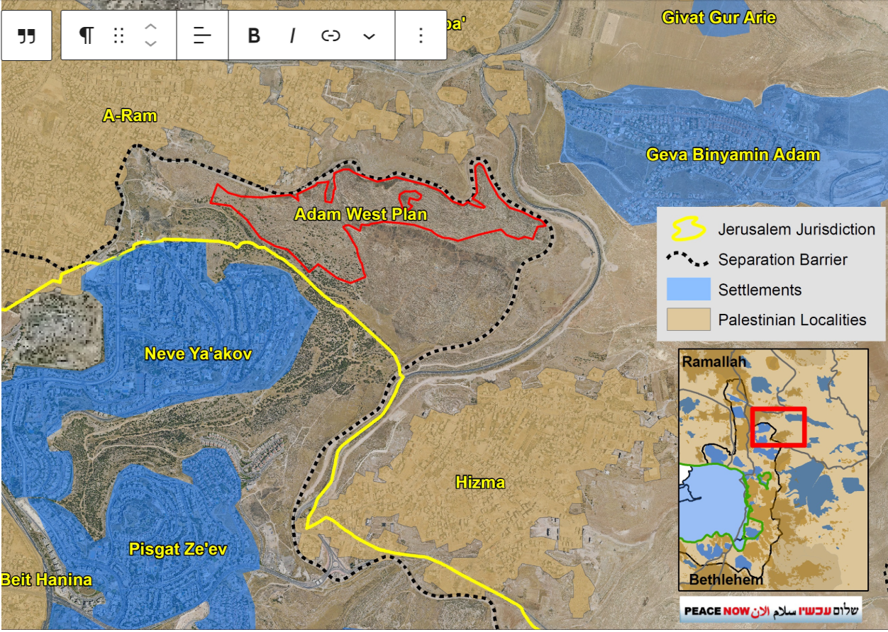 Como expandir formalmente a fronteira municipal de Jerusalém para dentro da Cisjordânia constituiria uma anexação oficial, o plano foi projetado para ser classificado como um “bairro” do assentamento de Adam e, oficialmente, não parte de Jerusalém. Na realidade, porém, não existe conexão física entre o assentamento de Adam e a nova área do assentamento, pois eles são separados pela barreira de separação e por uma estrada intermunicipal (Estrada 437).